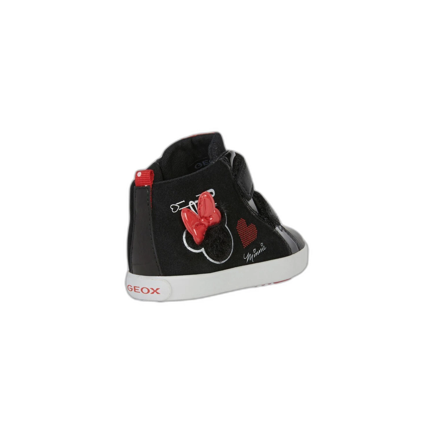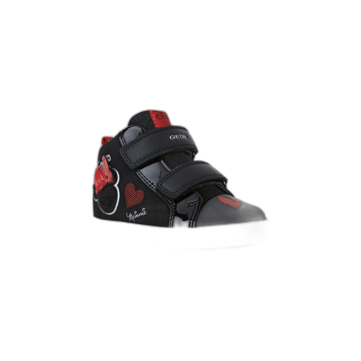 Réalisées en cuir velours et matière à effet cuir verni de couleur noire, les Kilwi arborent la silhouette de Minnie et son incontournable nœud rouge en version 3D.