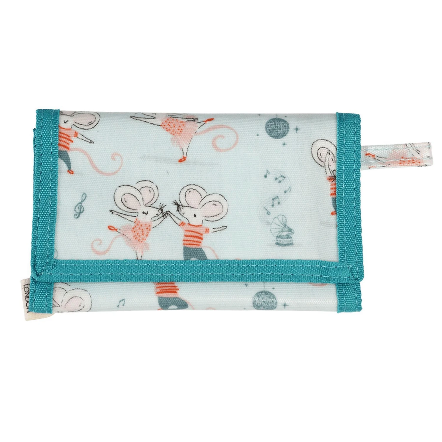 Portefeuille à trois volets pour enfants en aqua pâle avec notre imprimé de personnages de souris dansantes Mimi et Milo. Caractéristiques: fermeture velcroUne poche extérieure zippée, idéale pour ranger la monnaieUn grand compartiment, de taille adaptée aux billets de banquePlusieurs compartiments pour cartes avec orientations horizontales et verticalesUn compartiment pour carte avec fenêtre transparente, parfait pour les cartes d’identitéConseils d’entretien :Ne pas javelliser, laver, repasser, sécher au sèche-linge ou nettoyer à sec.Matériel: Coton, Métal, Toile cirée, Plastique, VelcroDimensions du produit: Largeur: 13,5cm, Longueur: 24,5cm, Hauteur: ,8cm, Poids: 58,7gDimensions du produit emballées: Largeur: 8,5cm, Longueur: 13,5cm, Hauteur: 1cm, Poids: 58,7g